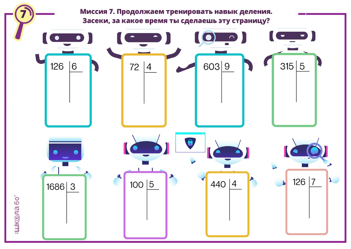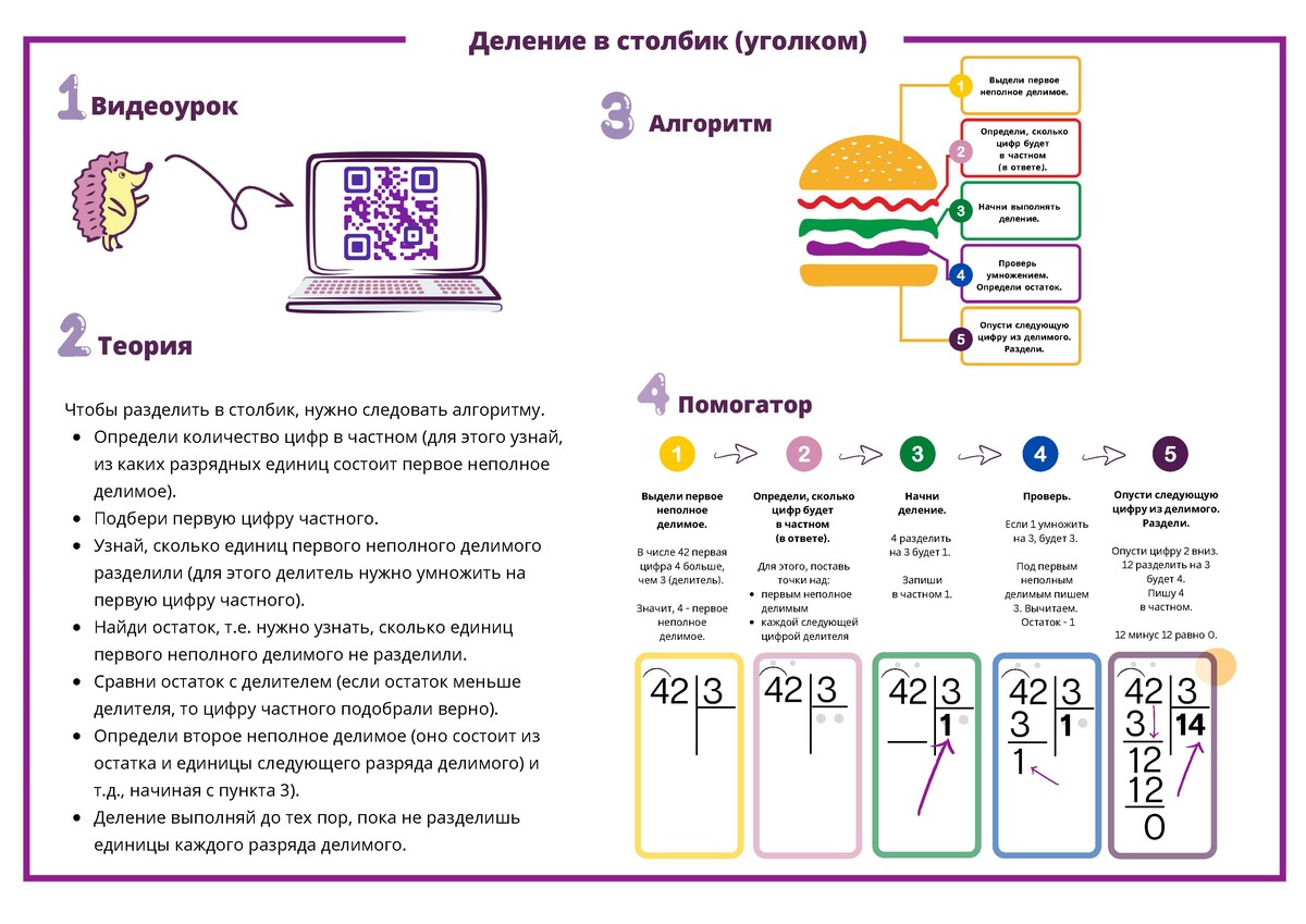 С помощью ярких упражнений школьник отработает тему "Деление в столбик" и научится выполнять письменное деление.