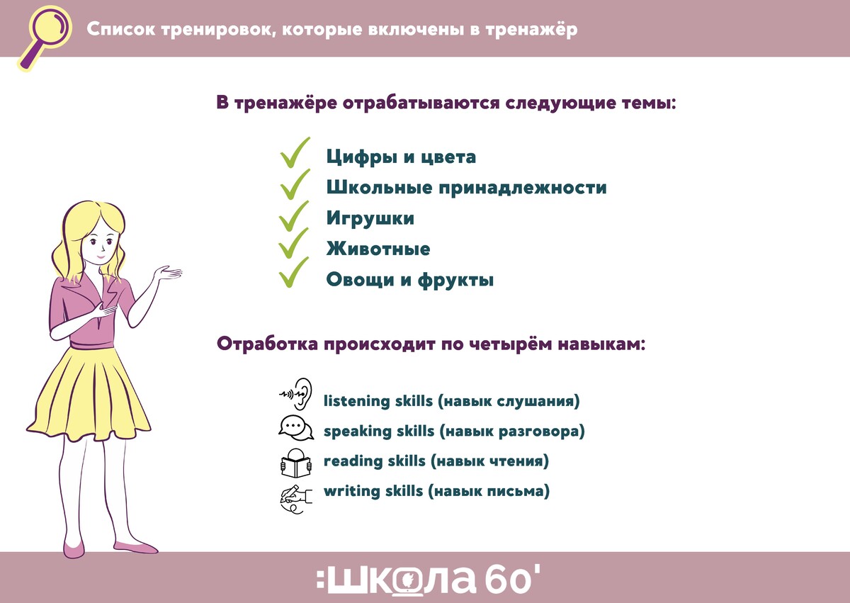 В каждой миссии — новые слова, а также упражнения на тренировку навыков: слушание, говорение, чтение, письмо.