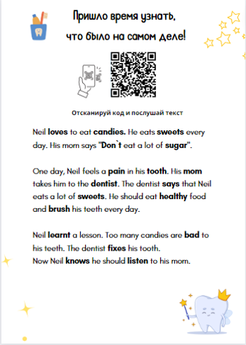 Наши истории не просто записаны на бумаге, они озвучены носителями языка. Отсканировав qr-код, вы сможете прослушать, как правильно читаются слова, где нужно поставить ударение и с какой интонацией прочитать.