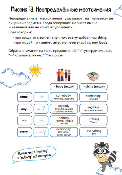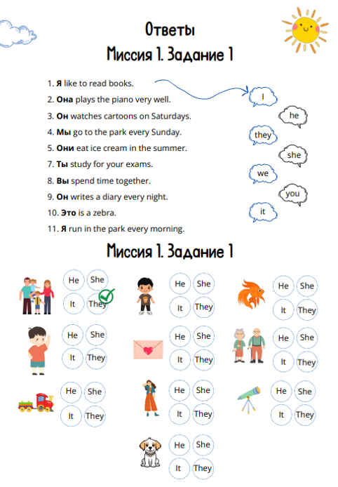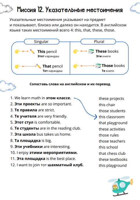 Наш тренажёр из 19 миссий представляет собой увлекательное и образовательное приключение, которое позволит сформировать знания по теме местоимения в английском языке, тренировать умственные способности и развивать логическое мышление.