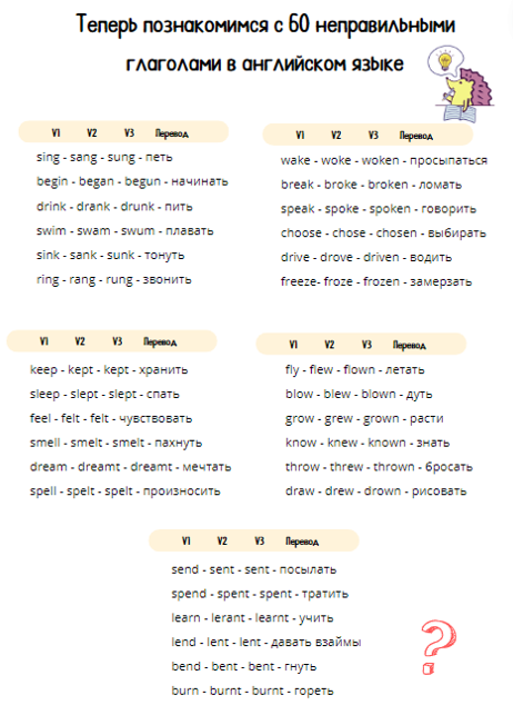 - выучит формы неправильных глаголов и их перевод;