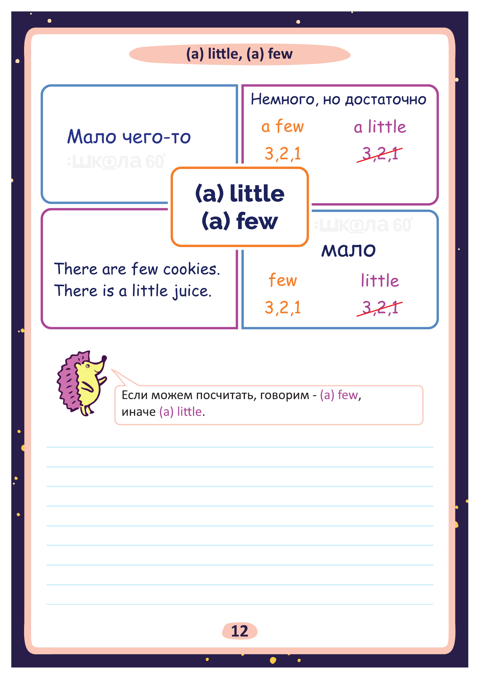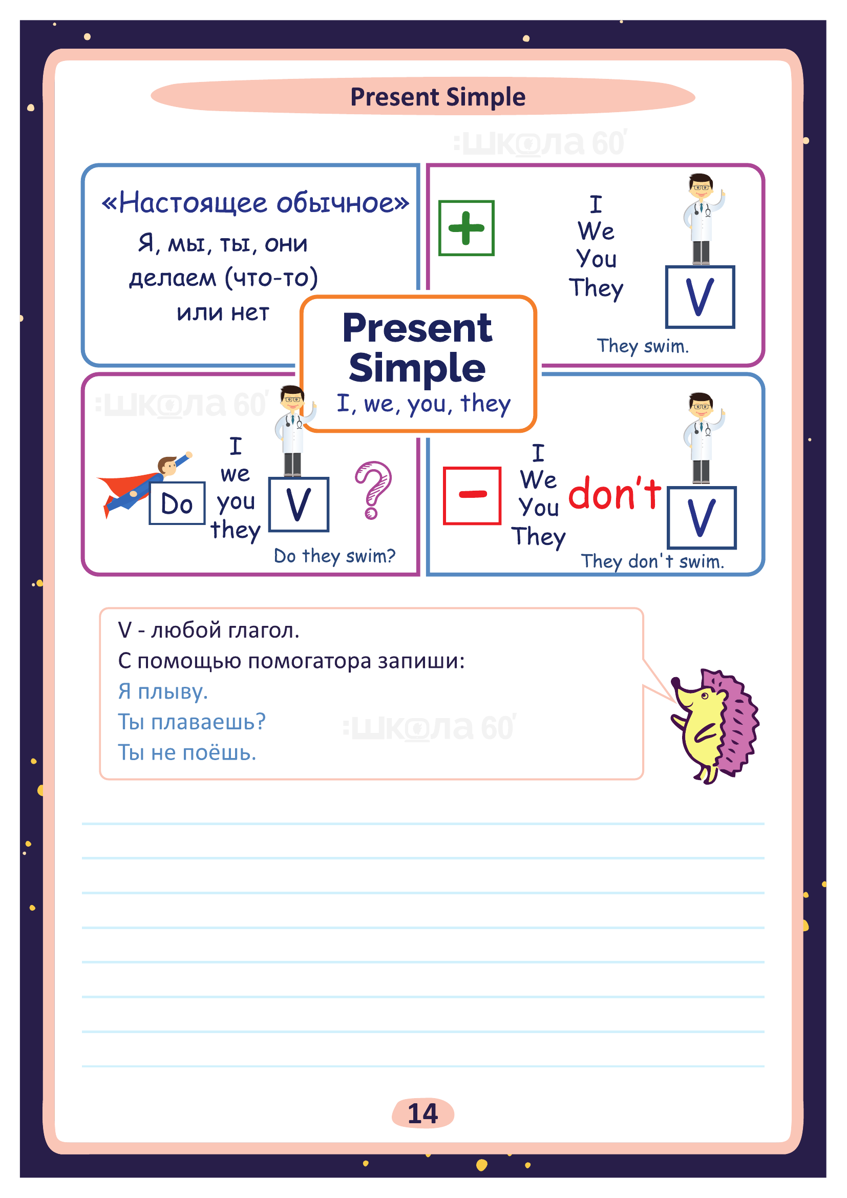 Графические авторские cхемы, которые позволяют наглядно увидеть тему, систематизировать, разобраться в ней, запомнить и конечно, легко повторить в конце четверти перед контрольными или аттестацией. Какие темы входят в помогаторы:4 класс There is. There are Множественное число Предлоги места Степени сравнения Глагол to bе Числительные в пределах 10 Числительные в пределах 100 Much - many (a) few, (a) little Притяжательные местоимения Present Simple Present Simple. 3 лицо Present Simple Present Simple. Специальный вопрос Present Continuous Present Continuous. Специальный вопрос Вопрос с выбором Can/can't Притяжательный падеж Past Simple Past Simple. Специальный вопрос Порядковые числительные Предлоги времени in, on, at Was / were There was. There were Some / any Future Simple Future Simple. Специальный вопрос Конструкция «to be going to» Must Present Perfect Present Perfect. Специальный вопрос General question Tag questions Неправильные глагол