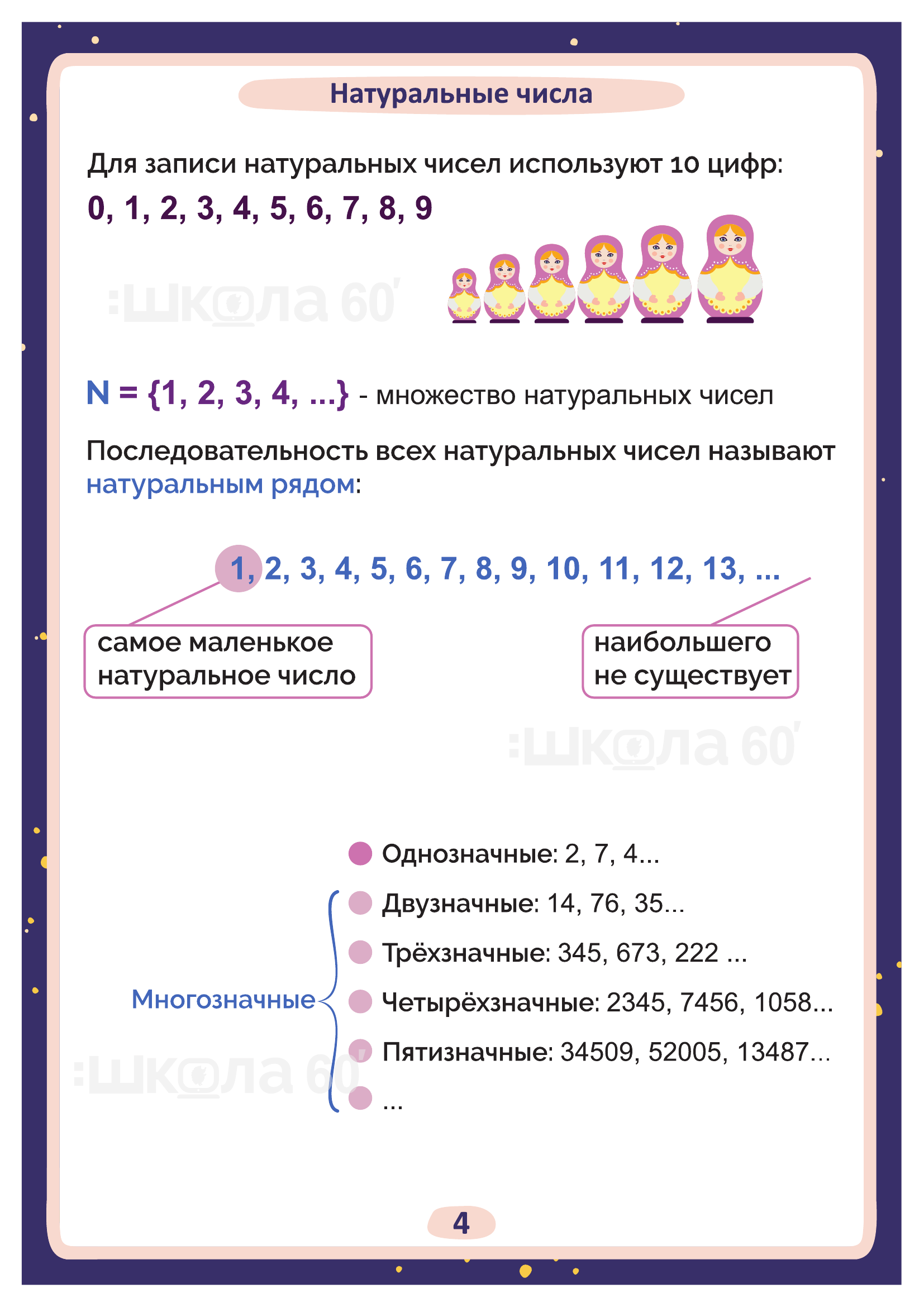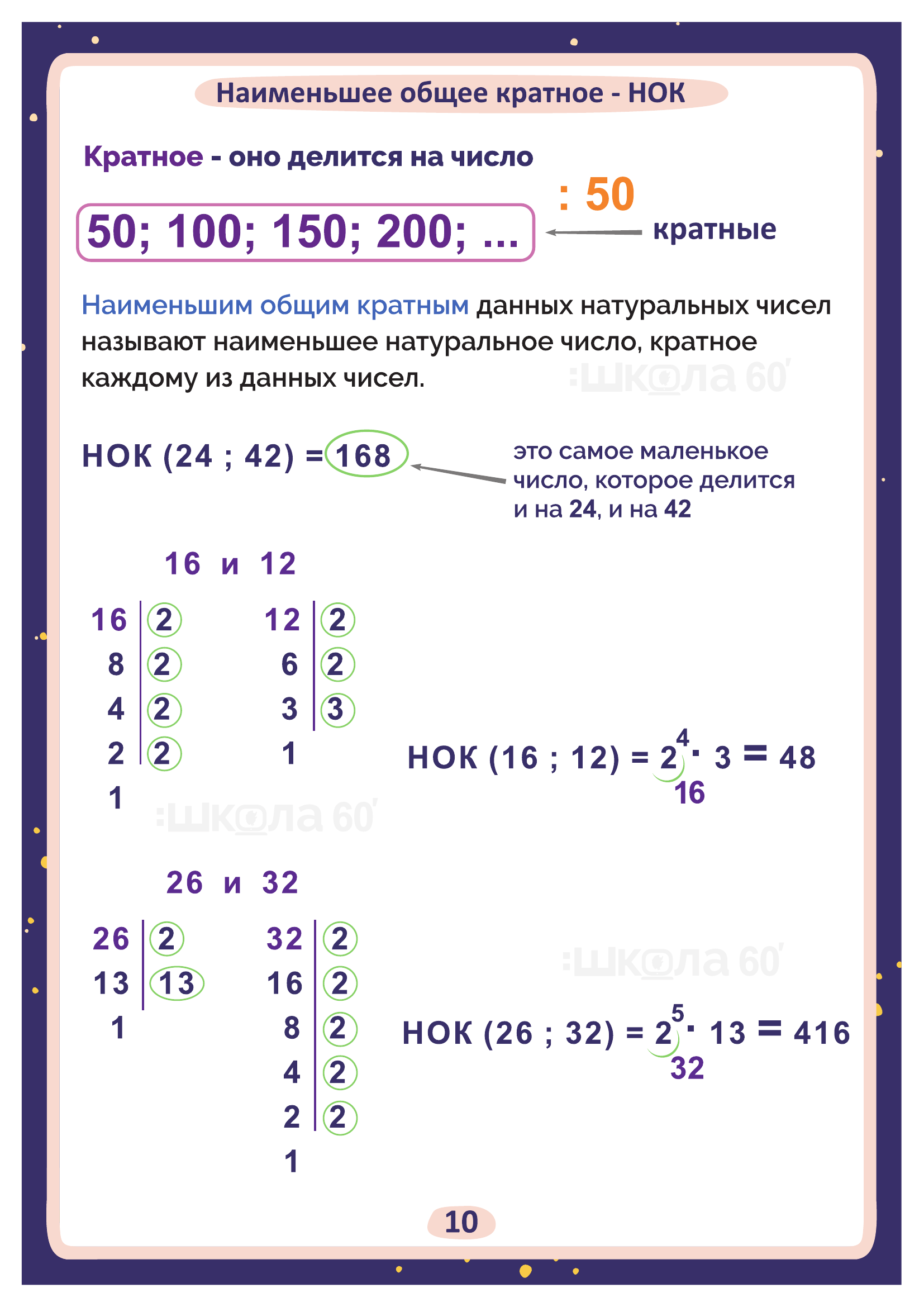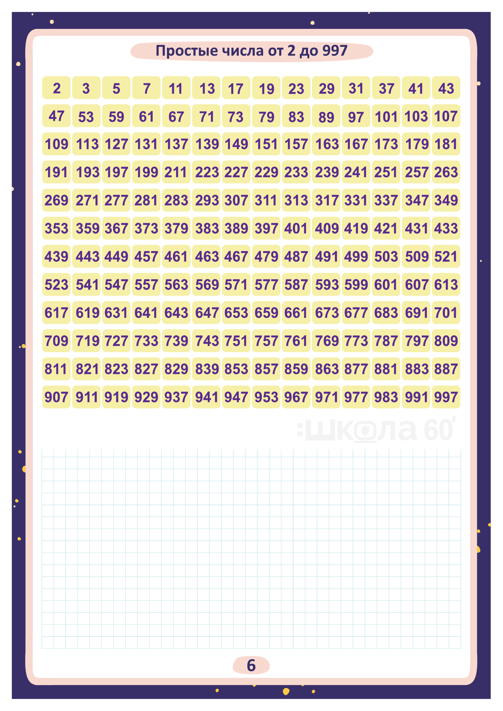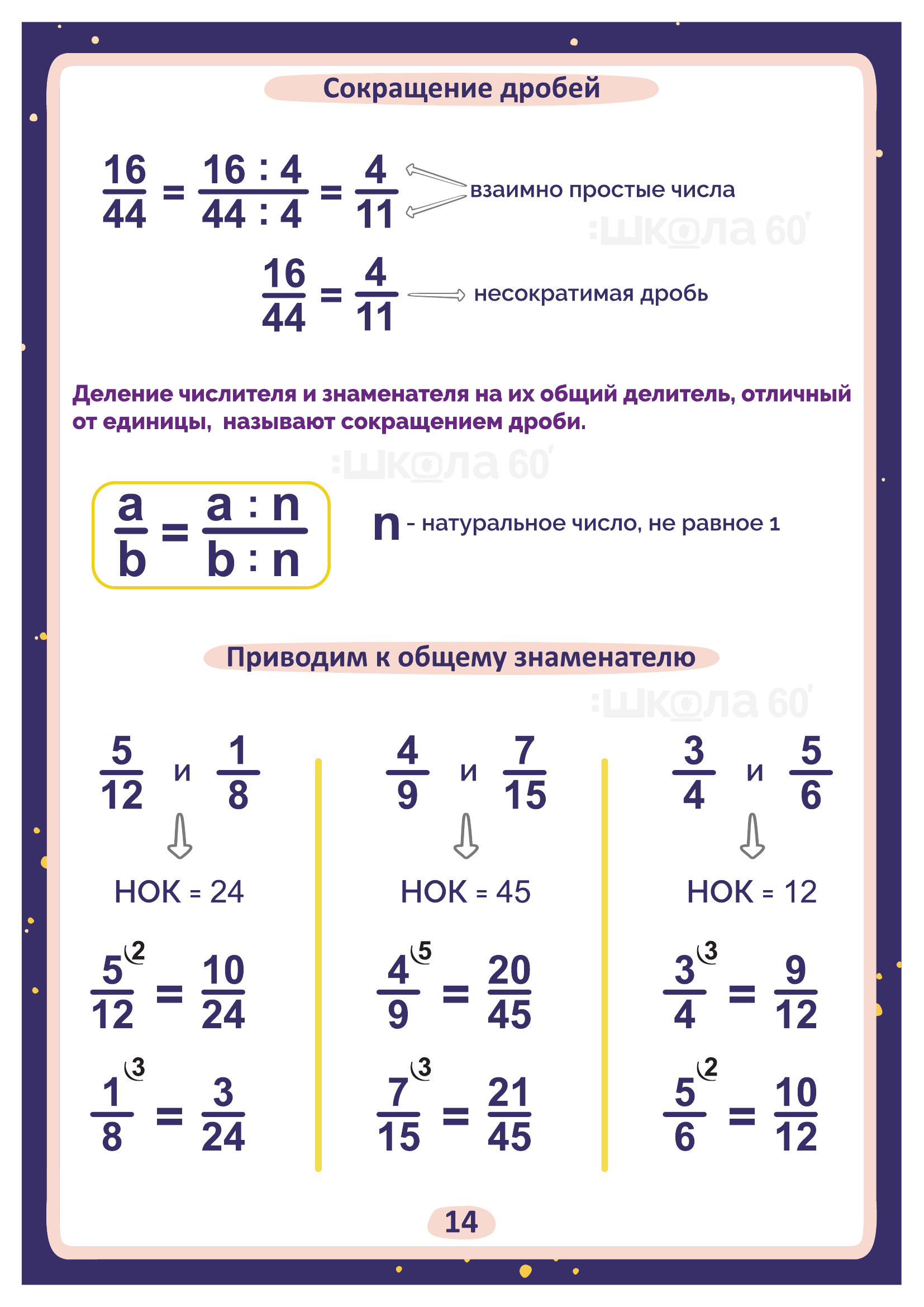 Графические авторские cхемы, которые позволяют наглядно увидеть тему, систематизировать, разобраться в ней, запомнить и конечно, легко повторить в конце четверти перед контрольными или аттестацией. Какие темы входят в помогаторы:6 класс Цифры и числа Натуральные числа Простые числа от 2 до 997 Натуральные числа Признаки делимости Разложение на простые множители Наибольший общий делитель (НОД) Взаимно простые числа Наименьшее общее кратное (НОК) Обыкновенные дроби Основное свойство дроби Сокращение дробей Приведение к общему знаменателю Сложение дробей Вычитание дробей Переместительный закон умножения Сочетательный закон умножения Распределительный закон умножения Деление дробей Пропорция Основное свойство пропорции Масштаб Окружность Круг и окружность Число Пи Площадь круга Шар Рациональные числа Положительные и отрицательные числа Модуль числа Сравнение чисел Сложение чисел с помощью координатной прямой Действия с отрицательными числами Рациональные числа Решение уравнений Коэффициент Перпендикулярные прямые Параллельные прямые Система координат на плоскости Диаграммы