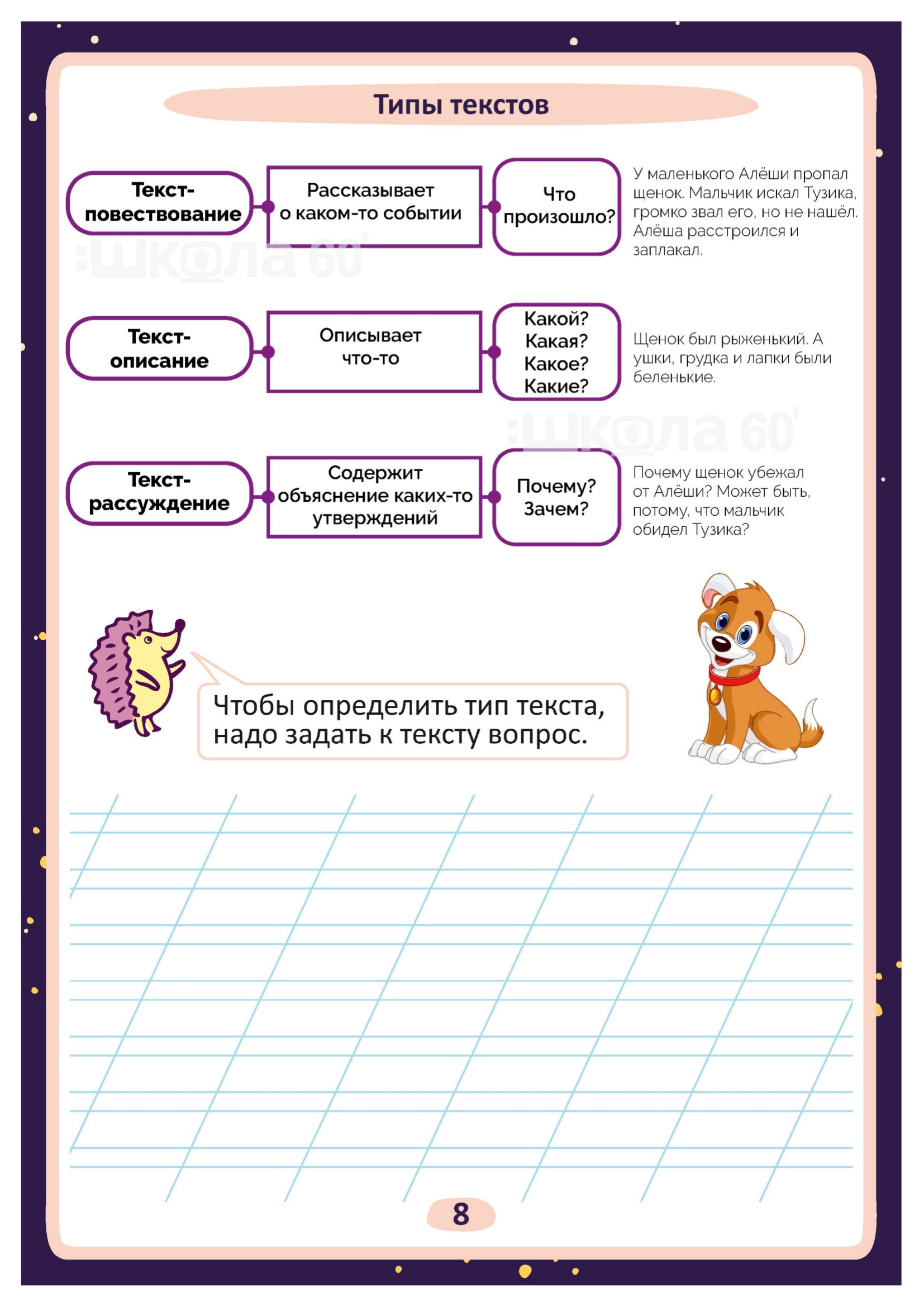 Графические авторские cхемы, которые позволяют наглядно увидеть тему, систематизировать, разобраться в ней, запомнить и конечно, легко повторить в конце четверти перед контрольными или аттестацией. Какие темы входят в помогаторы:2 класс Пиши красиво! Речь Текст Типы текстов Предложения (по цели высказывания) Предложения (по интонации) Главные члены предложения Многозначные слова Прямое и переносное значение слов Йотированные гласные Орфограммы -жи-ши, -чу-щу-, -ча-ща- Перенос слова Заглавная буква Сочетание букв ЧК, ЧН, НЧ, ЩН, НЩ Разделительный -Ь- Парные согласные Безударные гласные Однокоренные слова Слова с удвоенным согласным Орфограммы. Имя существительное Имя существительное. Одушевлённые и неодушевлённые Имя существительное. Собственные и нарицательные Имя существительное. Большая буква Имя существительное. Единственное и множественное число Имя прилагательное Имя прилагательное. Синонимы, антонимы Глагол