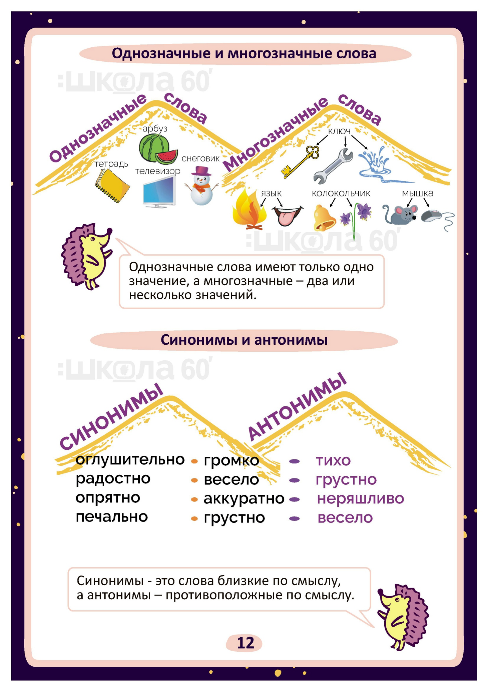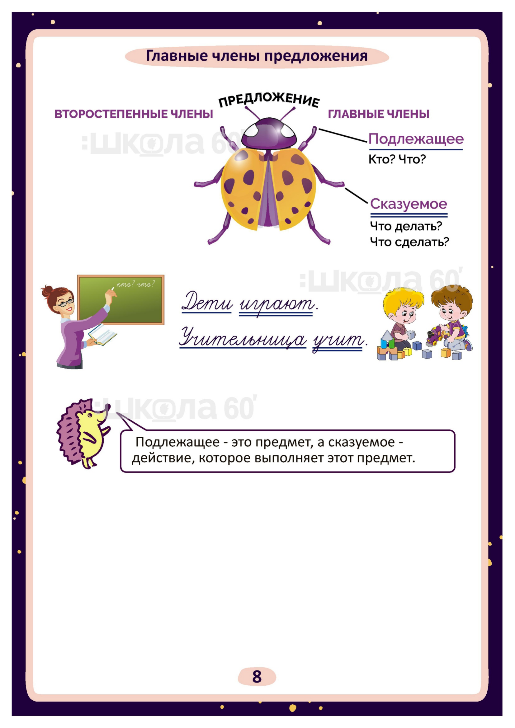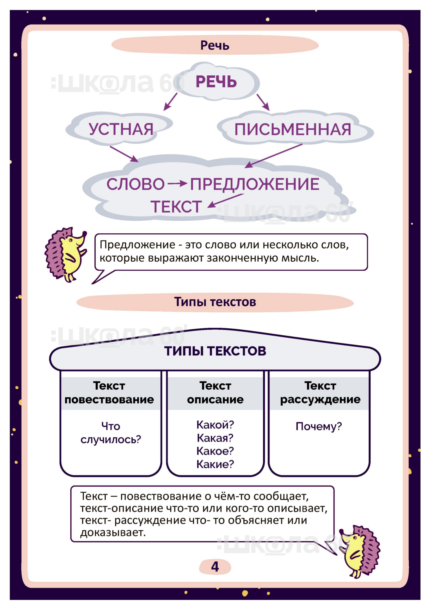 Графические авторские cхемы, которые позволяют наглядно увидеть тему, систематизировать, разобраться в ней, запомнить и конечно, легко повторить в конце четверти перед контрольными или аттестацией. Какие темы входят в помогаторы:3 класс Речь Типы текстов Определение типа текста Предложение по цели высказывания и интонации Предложение с обращением Предложение. Главные члены предложения Простое и сложное предложение Заглавная буква Словосочетание Многозначные слова Синонимы и антонимы Фразеологизмы Однокоренные слова Основа слова Разбор слова по составу Орфограммы Правописание слов с парными согласными Правописание слов с непроизносимыми согласными в корне Правописание приставок Правописание приставок и предлогов Правописание слов с разделительным твёрдым знаком Правописание слов с разделительным мягким знаком Мягкий знак на конце существительных Части речи Имя существительное как часть речи Одушевлённые и неодушевлённые имена существительные Собственные и нарицательные имена существительные Число имён существительных Род имён существительных Мягкий знак после шипящих на конце имён существительных Изменение имён существительных по падежам Робот имени существительного Морфологический разбор имени существительного Главные и второстепенные члены предложения Синтаксический разбор предложения Имя прилагательное как часть речи Связь имени прилагательного с именем существительным Изменение имён прилагательных по родам Изменение имён прилагательных по числам Изменение имён прилагательных по падежам Повторение. Робот имени прилагательного Морфологический разбор имени прилагательного Личные местоимения Морфологический разбор местоимения Имя числительное Морфологический разбор имени числительного Глагол как часть речи. Начальная форма глагола Изменение глаголов по временам Правописание частицы НЕ с глаголами Изменение глаголов прошедшего времени по родам Робот глагол Морфологический разбор глагола Звуко-буквенный анализ Фонетический разбор слова