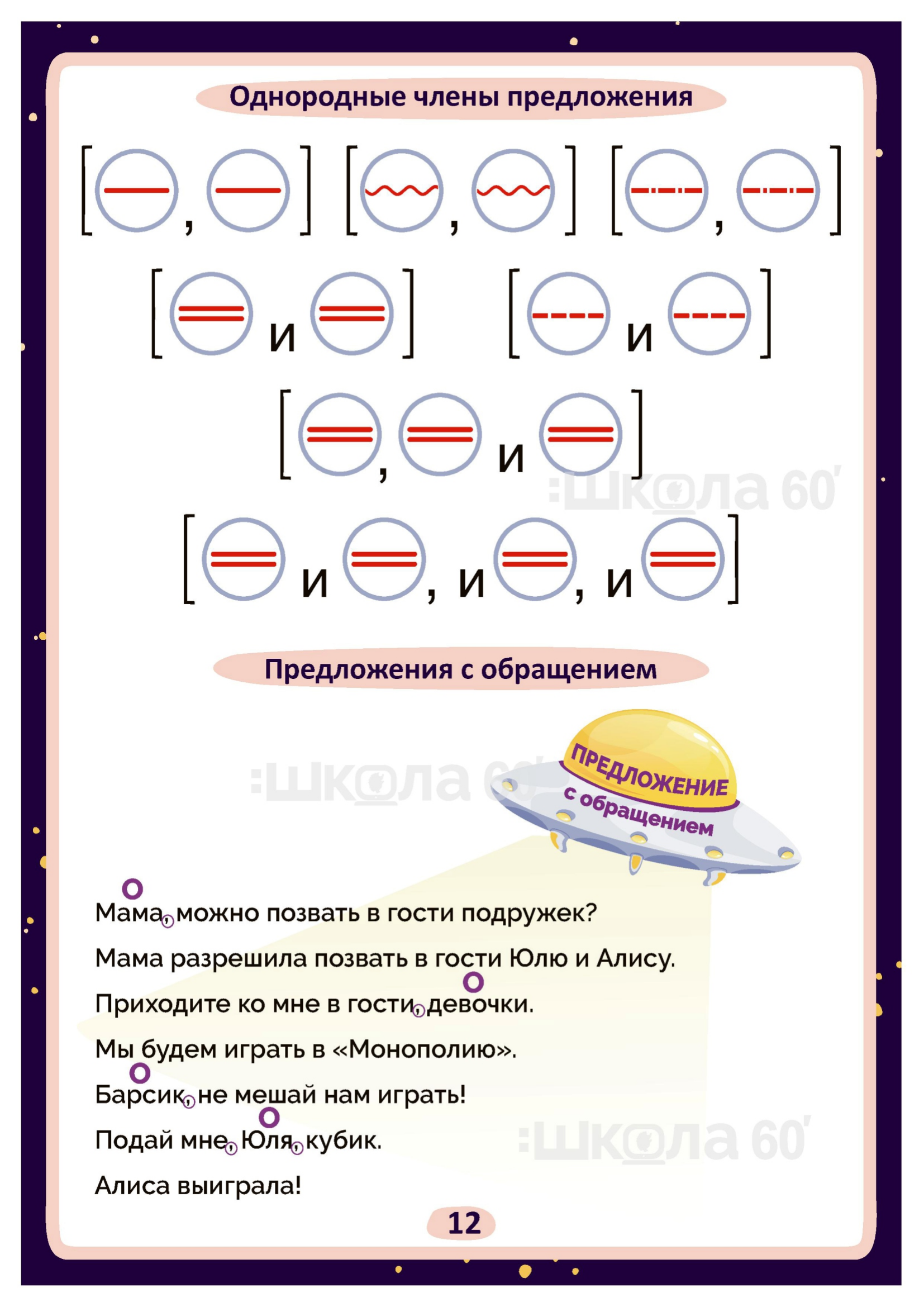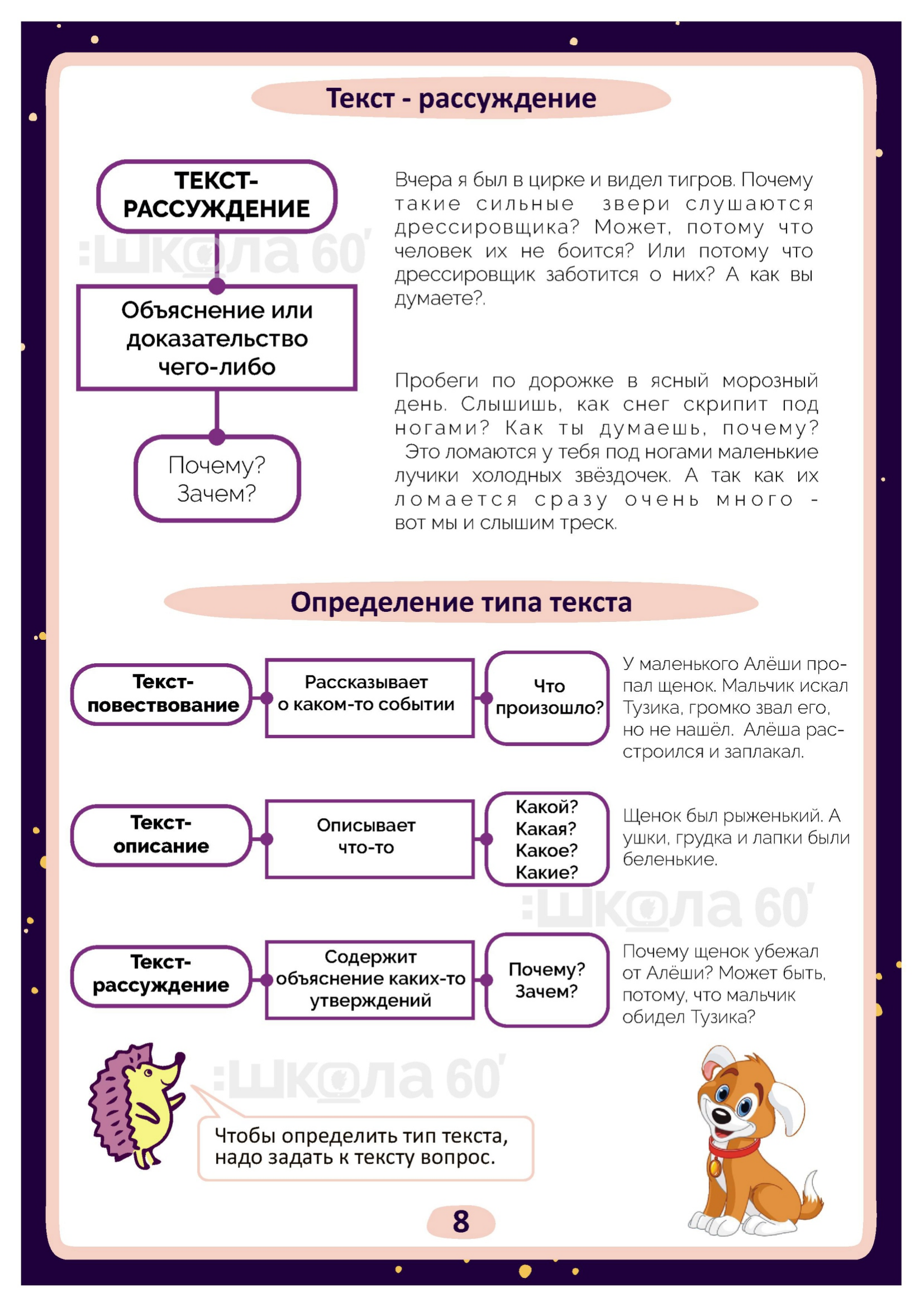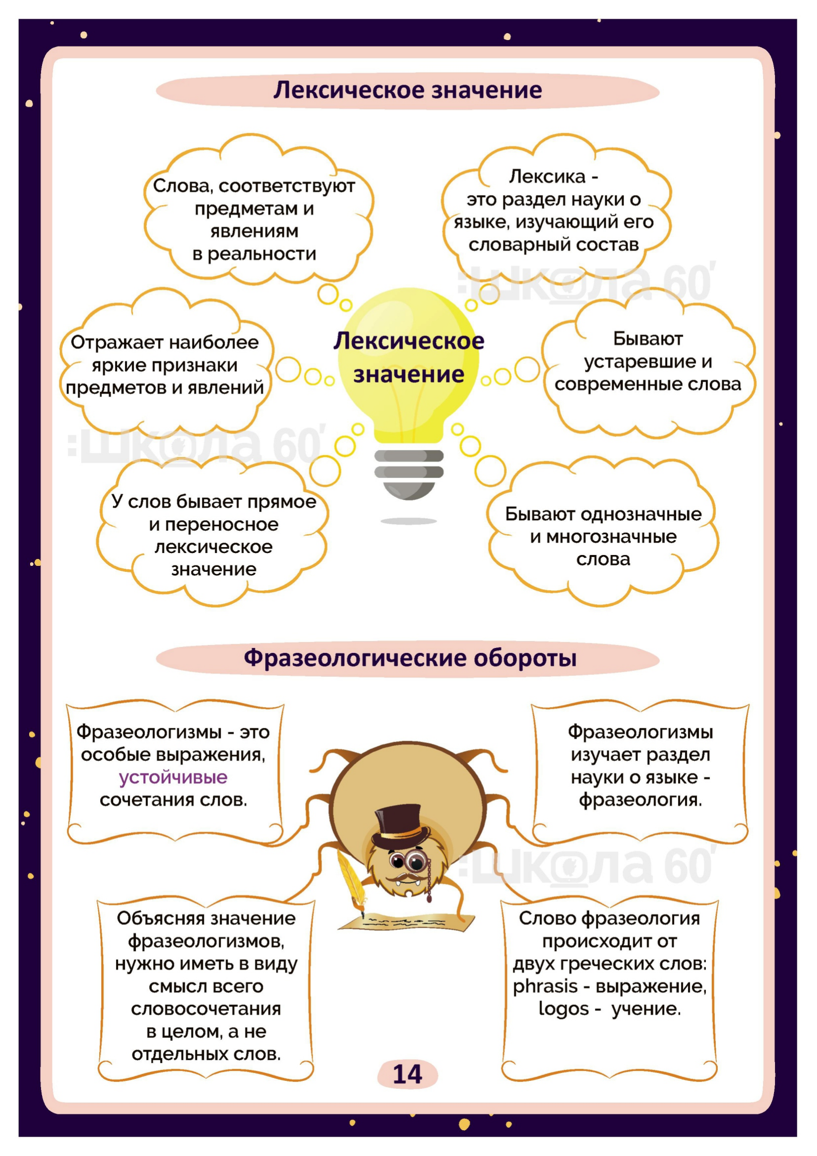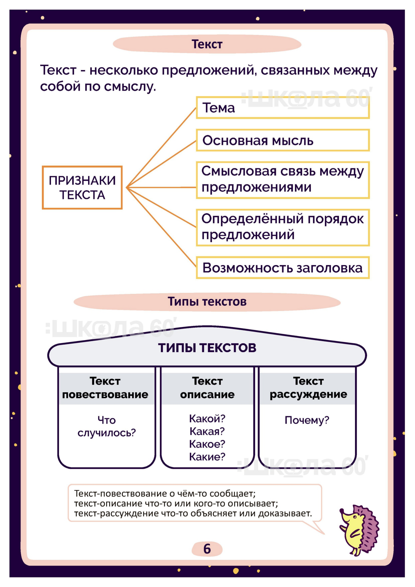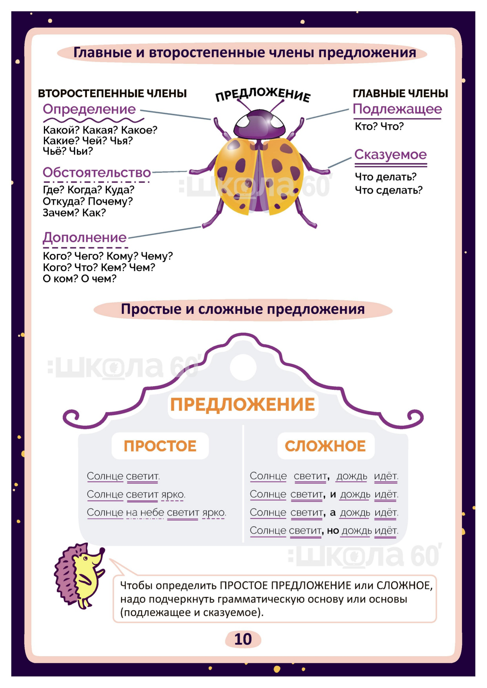 Графические авторские cхемы, которые позволяют наглядно увидеть тему, систематизировать, разобраться в ней, запомнить и конечно, легко повторить в конце четверти перед контрольными или аттестацией. Какие темы входят в помогаторы:4 класс Речь Виды речи Речевой этикет Текст Типы текстов Определение типа текста Предложение по цели высказывания и интонации Главные члены предложения Простое и сложное предложение Предложение Словосочетание Однородные члены предложения Предложение с обращением Простые и сложные предложения Лексическое значение Фразеологические обороты Омонимы. Синонимы. Антонимы Синтаксический разбор предложения Фонетический разбор Однокоренные слова Разбор слова по составу Морфология Служебные части речи Самостоятельные части речи Изменение самостоятельных частей речи Наречие Гласные О, А на конце наречий Имя существительное Собственные и нарицательные имена существительные Одушевлённые и неодушевлённые имена существительные Изменение по числам имён существительных Род имён существительных Склонение имён существительных Несклоняемые имена существительные Имя прилагательное Изменение имён прилагательных по падежам Разряды имён прилагательных Морфологический разбор имени прилагательного Личные местоимения Морфологический разбор местоимения Глагол Наклонение глагола Спряжение глагола Как определить спряжение глагола? Безударные окончания глаголов Глагол. Прошедшее время Морфологический разбор глагола Орфограммы имён существительных Орфограммы имён прилагательных Орфограммы глаголов Орфограммы Безударные гласные Парные согласные Разделительные Ъ и Ь Слова с непроизносимыми согласными Слова с удвоенными согласными Правописание приставок Суффиксы -ек, -ик Правописание приставок и предлогов Мягкий знак после шипящих Буквосочетания ЧК, ЧН, НЧ, НЩ, РЩ Виды разборов