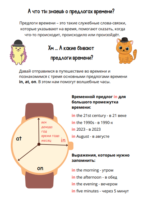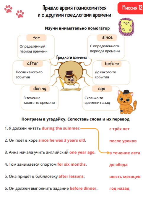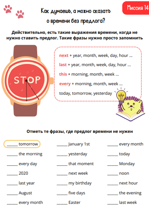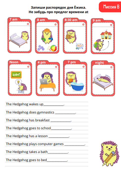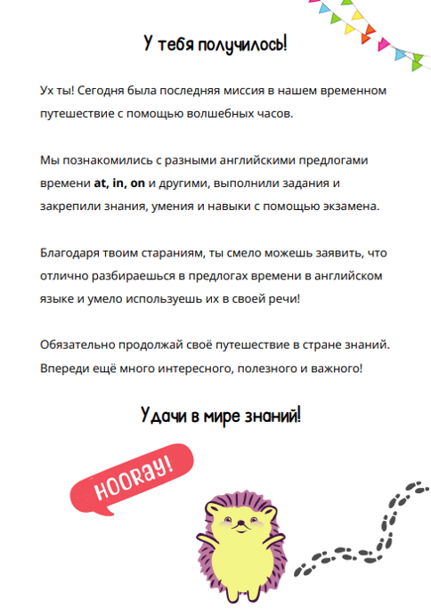 Наш тренажёр состоит из 15 интересных миссий с заданиями в игровой форме по теме «Предлоги времени» и итоговая миссия, с помощью которых ребёнок получит важные знания и отличную практику в использовании предлогов времени английского языка.