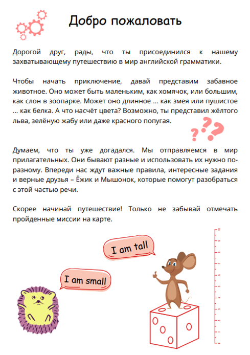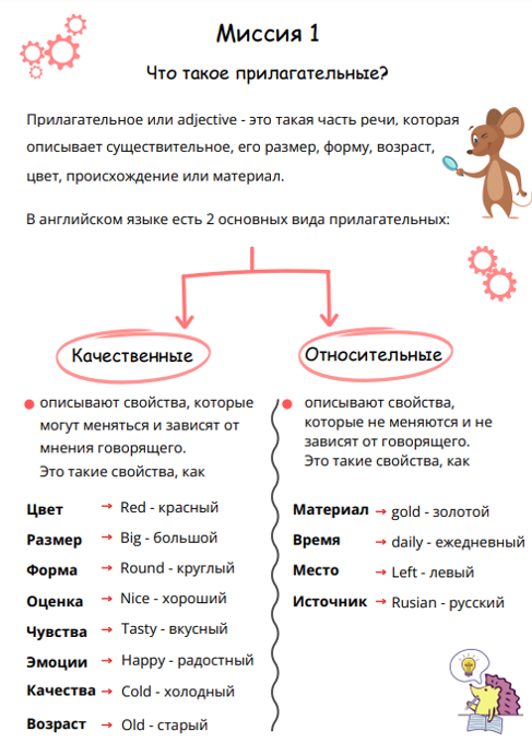 В каждой из 10 миссий вас ждут важные грамматические правила в форме помогаторов по теме “Английские прилагательные”, интересные задания на закрепление полученных знаний и хорошее настроение!