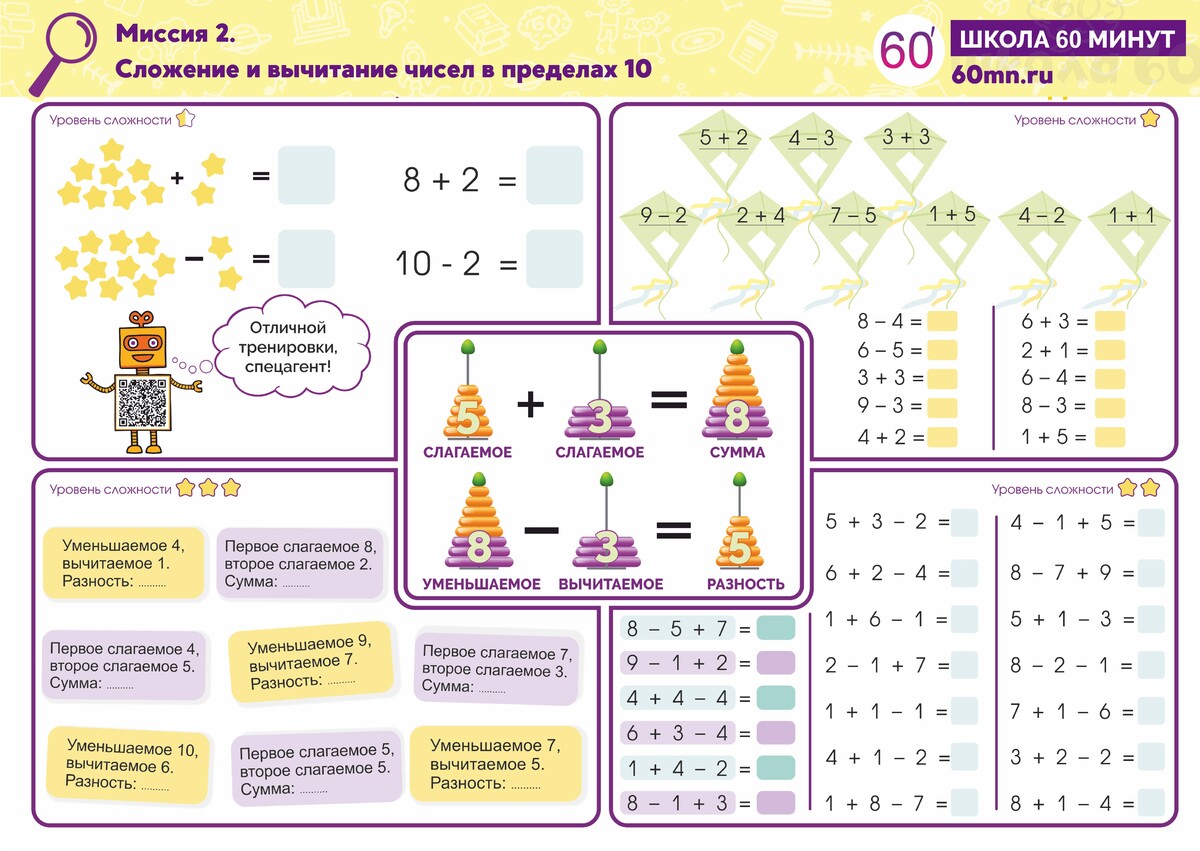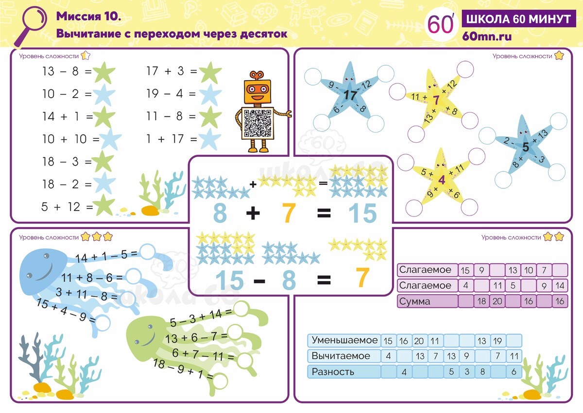- отработает сложение и вычитание чисел в пределах 20 с переходом через десяток
