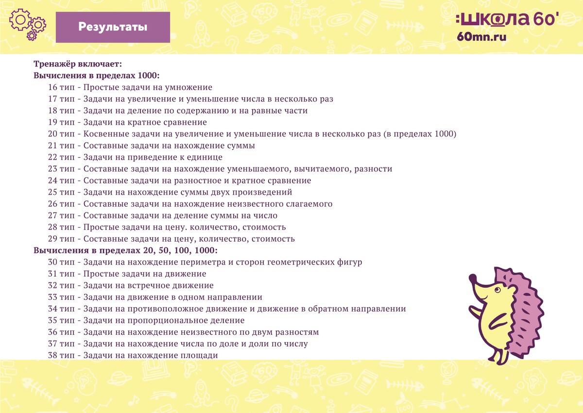 В результате занятий с тренажёром ребёнок познакомиться с типами задач 4 класса и научится их решать: оформлять краткую запись, делать чёртеж, рассуждать над решением задачи и оформлять решение.
