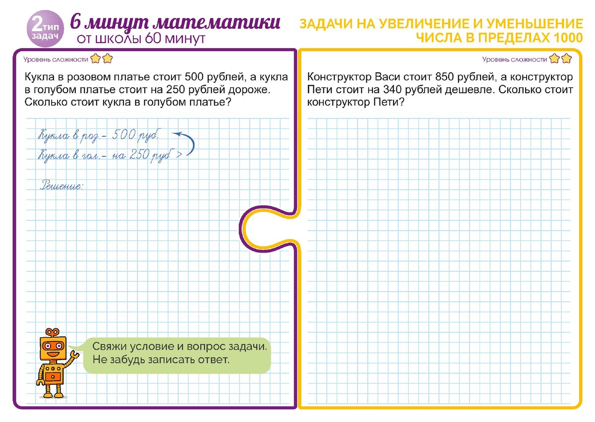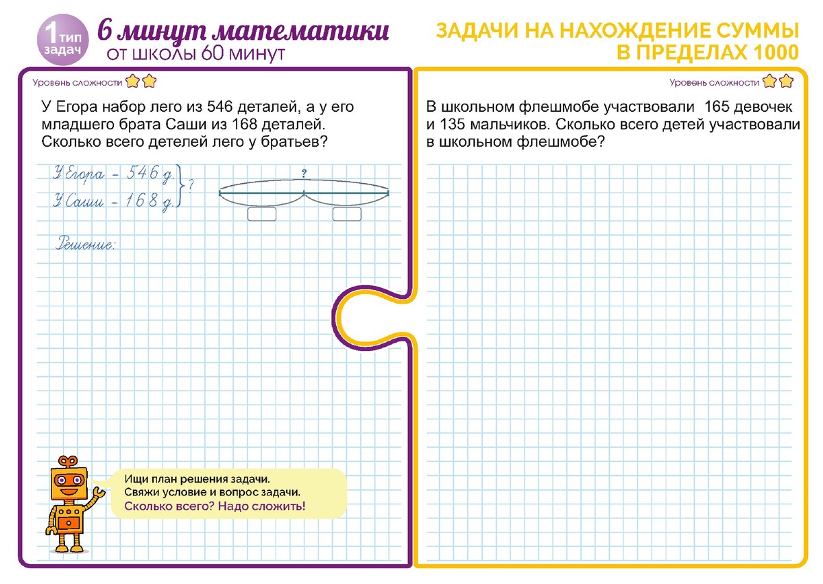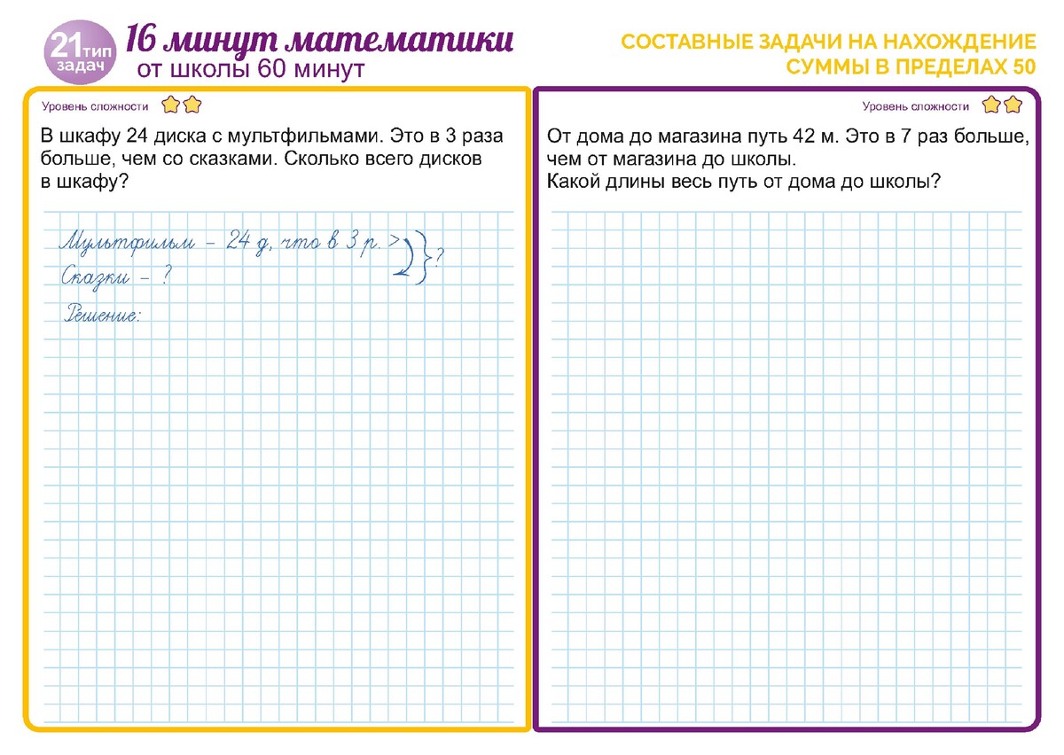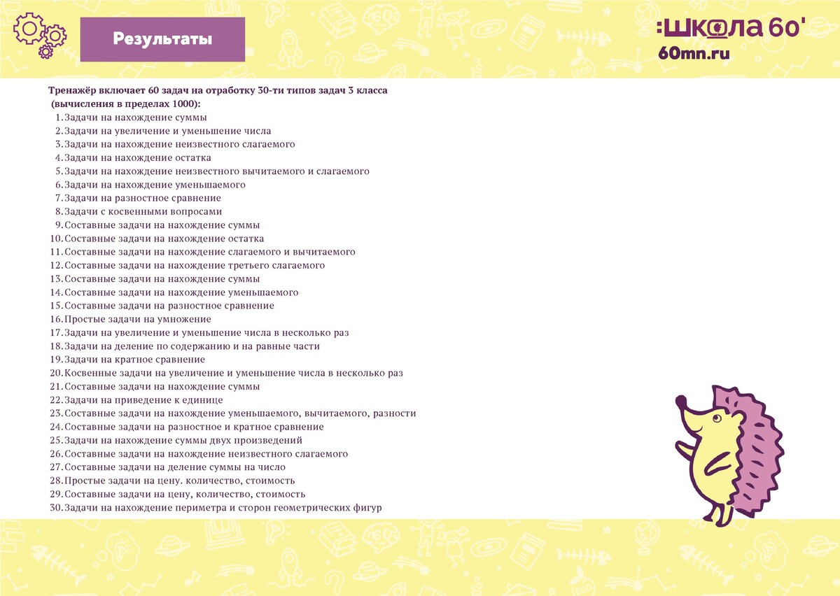 В результате занятий с тренажёром ребёнок познакомиться с типами задач 3 класса и научится их решать: оформлять краткую запись, делать чёртеж, рассуждать над решением задачи и оформлять решение.
